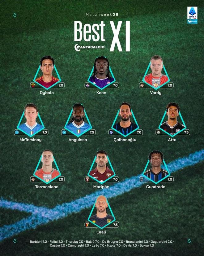北京時間10月27日,意甲官方公布聯(lián)賽第8輪的最佳陣容,恰爾汗奧盧、麥克托米奈、迪巴拉、瓦爾迪入選。